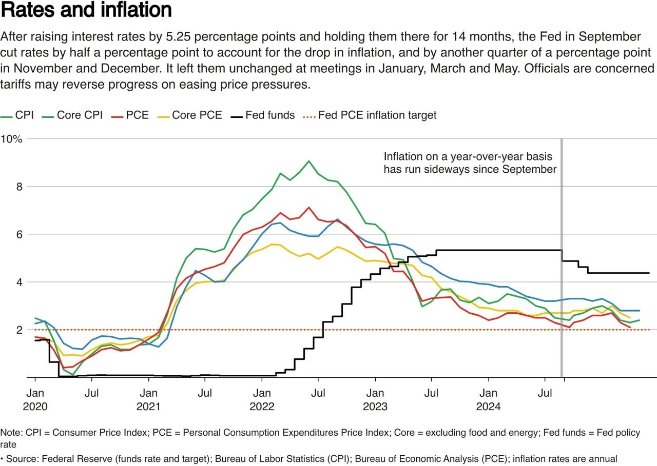 Trump's push to rewrite the rules of global trade also remains a work in progress, with potentially inflationary results. Since the Fed's last policy meeting in May, the administration delayed until next month a threatened round of global tariffs that central bank officials worry could lead to both higher prices and slower growth if implemented; trade tensions between the U.S. and China have eased but not been resolved; and the terms of a massive budget and tax bill under consideration in Congress are far from settled.